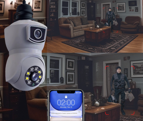 Features dual Full HD cameras with color night vision, offering 360° rotation and up to 10x zoom on the primary camera, plus a wide-angle secondary camera. Easy to install by simply replacing a standard light bulb, with live viewing, motion alerts, and two-way audio directly on your phone.